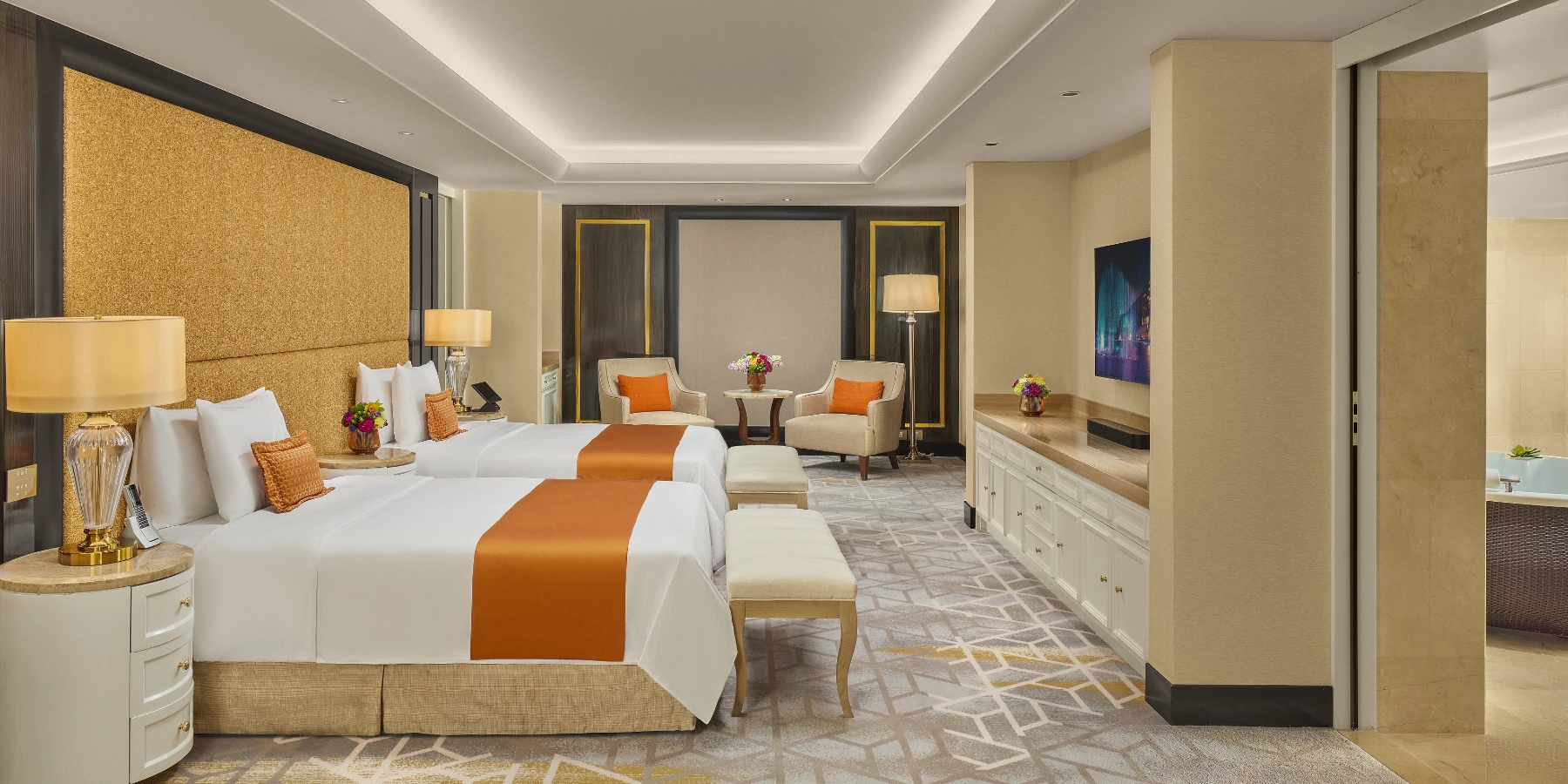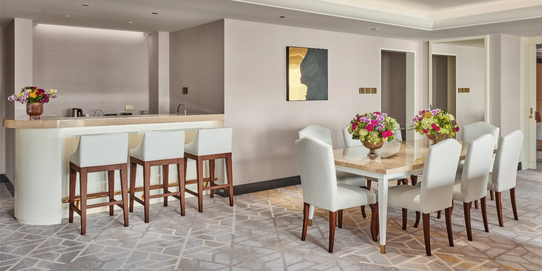 매혹적인 마닐라의 스카이라인과 어우러진 세련된 이그제큐티브 스위트에서 편안함을 만끽하세요. 200~250㎡에 이르는 이 스위트룸은 잘 꾸며진 거실과 식사 공간, 커피를 즐길 수 있는 네스프레소 머신을 비롯해 최고급 커피만을 엄선하여 구비한 바를 갖추고 있습니다. 킹사이즈 침대 또는 씰리 매트리스가 있는 더블 침대, 욕조, 레인 샤워기, 디자이너 어메니티가 구비되어 있어 정말 놀라운 경험을 선사합니다.