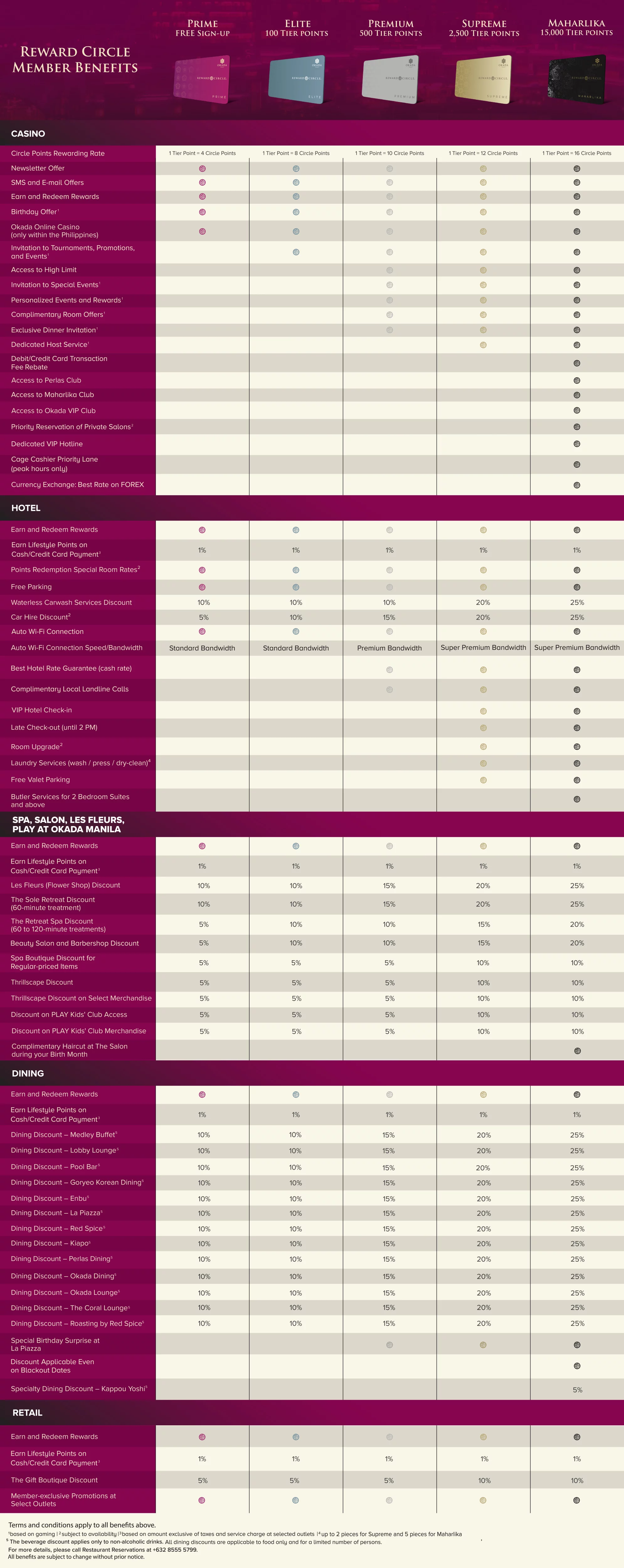 我们非常荣幸地欢迎您加入马尼拉发展最快的会员计划:Reward Circle。 作为会员,您可以享受各种奖励和特权,承认您是 Okada Manila 的尊贵客人。 通过我们的 Reward Circle 会员等级,可享受整个度假村的各种礼遇和升级优惠。